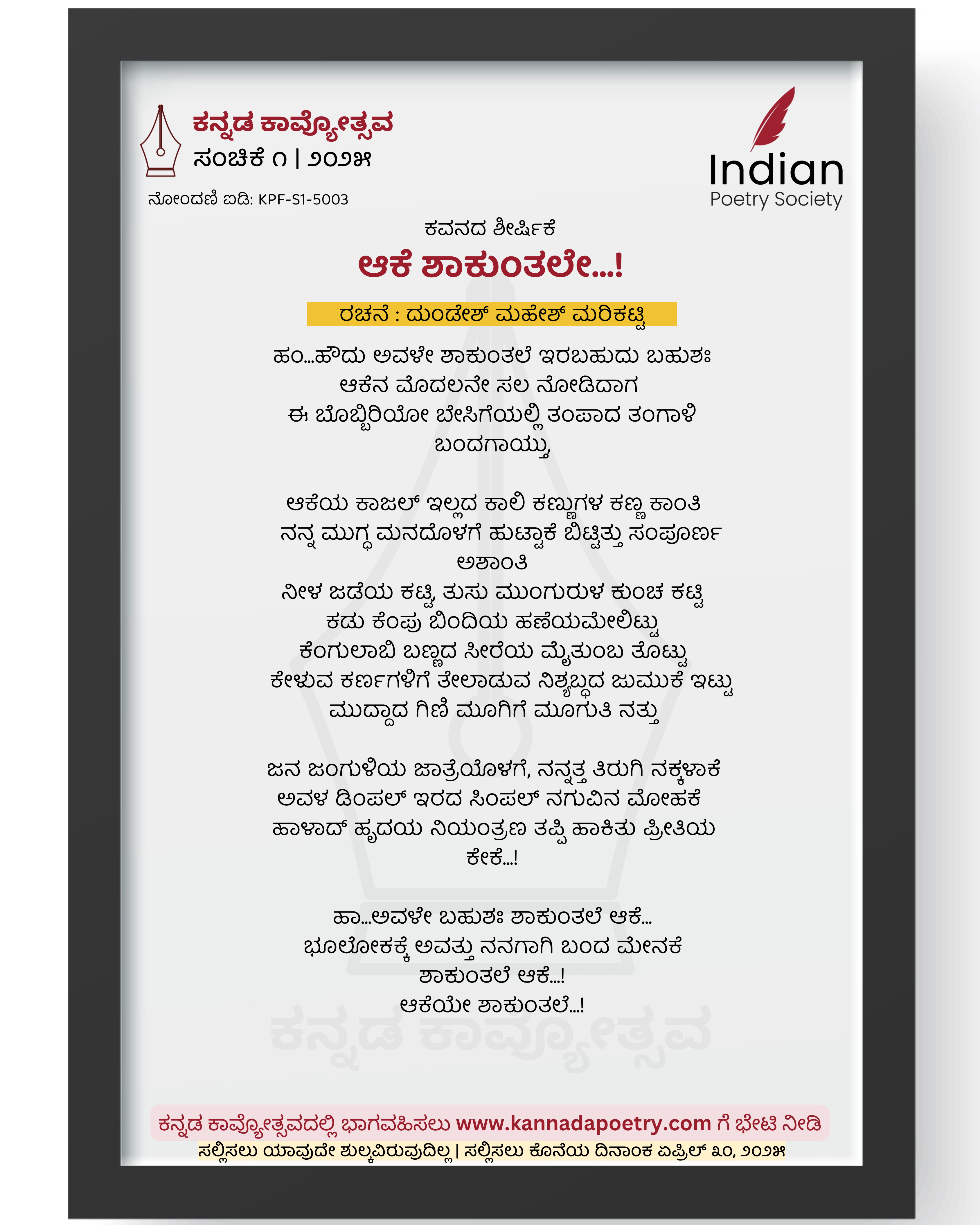 ಹಂ...ಹೌದು ಅವಳೇ ಶಾಕುಂತಲೆ ಇರಬಹುದು ಬಹುಶಃ ಆಕೆನ ಮೊದಲನೇ ಸಲ ನೋಡಿದಾಗ ಈ ಬೊಬ್ಬಿರಿಯೋ ಬೇಸಿಗೆಯಲ್ಲಿ ತಂಪಾದ ತಂಗಾಳಿ ಬಂದಗಾಯ್ತು, ಆಕೆಯ ಕಾಜಲ್ ಇಲ್ಲದ ಕಾಲಿ ಕಣ್ಣುಗಳ ಕಣ್ಣ ಕಾಂತಿ ನನ್ನ ಮುಗ್ಧ ಮನದೊಳಗೆ ಹುಟ್ಟಾಕೆ ಬಿಟ್ಟಿತ್ತು ಸಂಪೂರ್ಣ ಅಶಾಂತಿ ನೀಳ ಜಡೆಯ ಕಟ್ಟಿ, ತುಸು ಮುಂಗುರುಳ ಕುಂಚ ಕಟ್ಟಿ ಕಡು ಕೆಂಪು ಬಿಂದಿಯ ಹಣೆಯಮೇಲಿಟ್ಟು ಕೆಂಗುಲಾಬಿ ಬಣ್ಣದ ಸೀರೆಯ ಮೈತುಂಬ ತೊಟ್ಟು ಕೇಳುವ ಕರ್ಣಗಳಿಗೆ ತೇಲಾಡುವ ನಿಶ್ಯಬ್ಧದ ಜುಮುಕೆ ಇಟ್ಟು ಮುದ್ದಾದ ಗಿಣಿ ಮೂಗಿಗೆ ಮೂಗುತಿ ನತ್ತು ಜನ ಜಂಗುಳಿಯ ಜಾತ್ರೆಯೊಳಗೆ, ನನ್ನತ್ತ ತಿರುಗಿ ನಕ್ಕಳಾಕೆ ಅವಳ ಡಿಂಪಲ್ ಇರದ ಸಿಂಪಲ್ ನಗುವಿನ ಮೋಹಕೆ ಹಾಳಾದ್ ಹೃದಯ ನಿಯಂತ್ರಣ ತಪ್ಪಿ ಹಾಕಿತು ಪ್ರೀತಿಯ ಕೇಕೆ...! ಹಾ...ಅವಳೇ ಬಹುಶಃ ಶಾಕುಂತಲೆ ಆಕೆ... ಭೂಲೋಕಕ್ಕೆ ಅವತ್ತು ನನಗಾಗಿ ಬಂದ ಮೇನಕೆ ಶಾಕುಂತಲೆ ಆಕೆ...! ಆಕೆಯೇ ಶಾಕುಂತಲೆ...!
