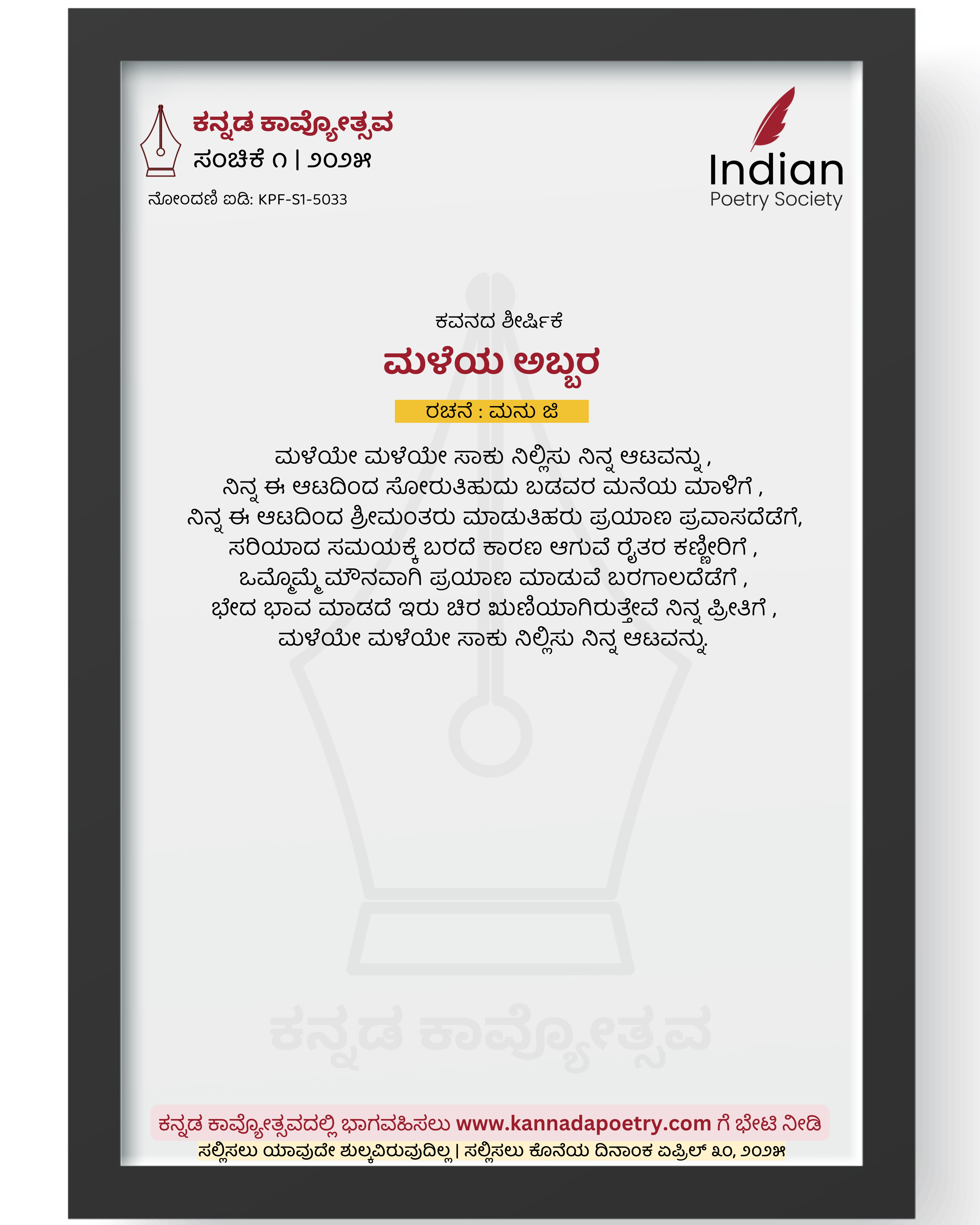 ಮಳೆಯೇ ಮಳೆಯೇ ಸಾಕು ನಿಲ್ಲಿಸು ನಿನ್ನ ಆಟವನ್ನು , ನಿನ್ನ ಈ ಆಟದಿಂದ ಸೋರುತಿಹುದು ಬಡವರ ಮನೆಯ ಮಾಳಿಗೆ , ನಿನ್ನ ಈ ಆಟದಿಂದ ಶ್ರೀಮಂತರು ಮಾಡುತಿಹರು ಪ್ರಯಾಣ ಪ್ರವಾಸದೆಡೆಗೆ, ಸರಿಯಾದ ಸಮಯಕ್ಕೆ ಬರದೆ ಕಾರಣ ಆಗುವೆ ರೈತರ ಕಣ್ಣೀರಿಗೆ , ಒಮ್ಮೊಮ್ಮೆ ಮೌನವಾಗಿ ಪ್ರಯಾಣ ಮಾಡುವೆ ಬರಗಾಲದೆಡೆಗೆ , ಭೇದ ಭಾವ ಮಾಡದೆ ಇರು ಚಿರ ಋಣಿಯಾಗಿರುತ್ತೇವೆ ನಿನ್ನ ಪ್ರೀತಿಗೆ , ಮಳೆಯೇ ಮಳೆಯೇ ಸಾಕು ನಿಲ್ಲಿಸು ನಿನ್ನ ಆಟವನ್ನು.