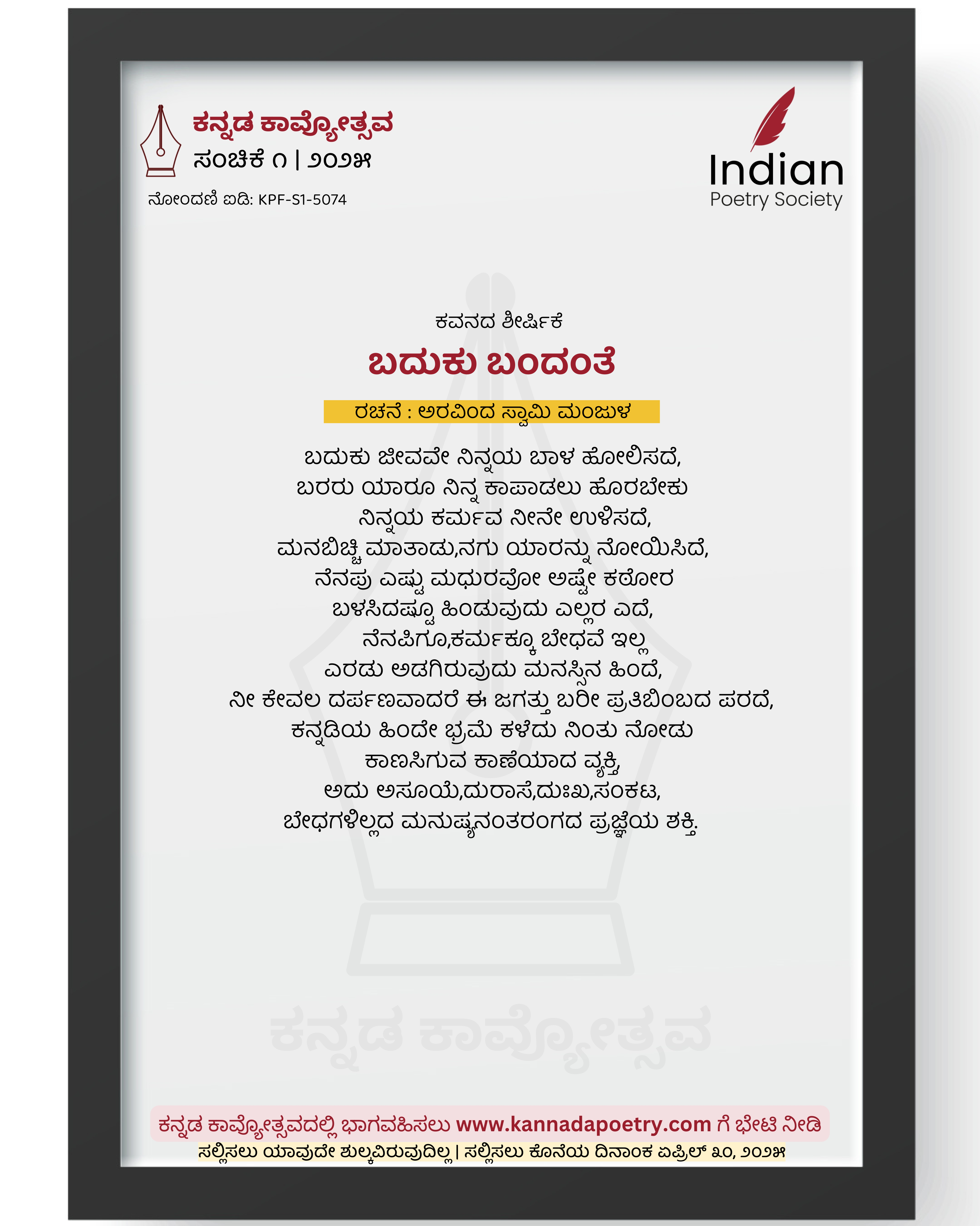 ಬದುಕು ಜೀವವೇ ನಿನ್ನಯ ಬಾಳ ಹೋಲಿಸದೆ, ಬರರು ಯಾರೂ ನಿನ್ನ ಕಾಪಾಡಲು ಹೊರಬೇಕು ನಿನ್ನಯ ಕರ್ಮವ ನೀನೇ ಉಳಿಸದೆ, ಮನಬಿಚ್ಚಿ ಮಾತಾಡು,ನಗು ಯಾರನ್ನು ನೋಯಿಸಿದೆ, ನೆನಪು ಎಷ್ಟು ಮಧುರವೋ ಅಷ್ಟೇ ಕಠೋರ ಬಳಸಿದಷ್ಟೂ ಹಿಂಡುವುದು ಎಲ್ಲರ ಎದೆ, ನೆನಪಿಗೂ,ಕರ್ಮಕ್ಕೂ ಬೇಧವೆ ಇಲ್ಲ ಎರಡು ಅಡಗಿರುವುದು ಮನಸ್ಸಿನ ಹಿಂದೆ, ನೀ ಕೇವಲ ದರ್ಪಣವಾದರೆ ಈ ಜಗತ್ತು ಬರೀ ಪ್ರತಿಬಿಂಬದ ಪರದೆ, ಕನ್ನಡಿಯ ಹಿಂದೇ ಭ್ರಮೆ ಕಳೆದು ನಿಂತು ನೋಡು ಕಾಣಸಿಗುವ ಕಾಣೆಯಾದ ವ್ಯಕ್ತಿ, ಅದು ಅಸೂಯೆ,ದುರಾಸೆ,ದುಃಖ,ಸಂಕಟ, ಬೇಧಗಳಿಲ್ಲದ ಮನುಷ್ಯನಂತರಂಗದ ಪ್ರಜ್ಞೆಯ ಶಕ್ತಿ.