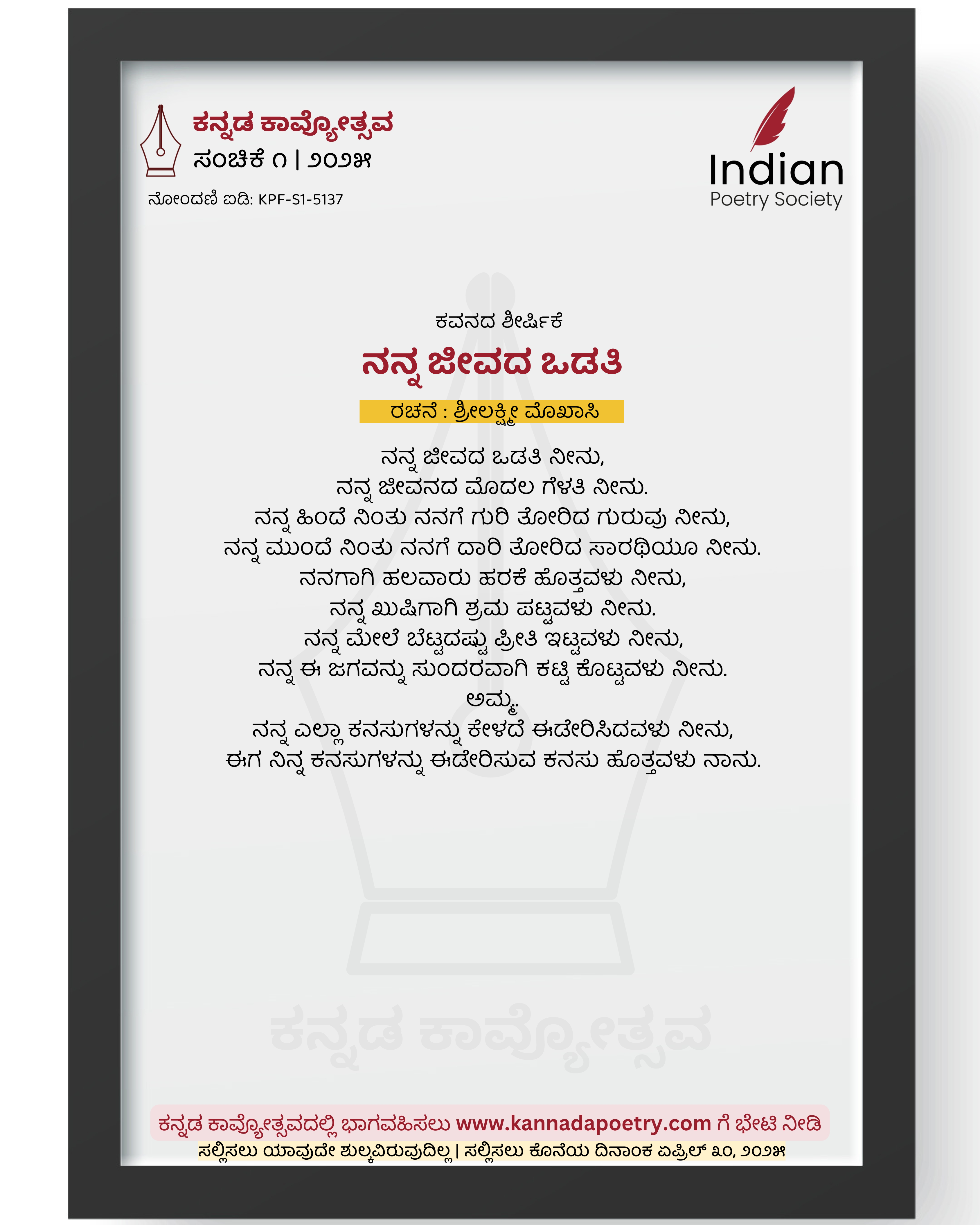 ನನ್ನ ಜೀವದ ಒಡತಿ ನೀನು, ನನ್ನ ಜೀವನದ ಮೊದಲ ಗೆಳತಿ ನೀನು. ನನ್ನ ಹಿಂದೆ ನಿಂತು ನನಗೆ ಗುರಿ ತೋರಿದ ಗುರುವು ನೀನು, ನನ್ನ ಮುಂದೆ ನಿಂತು ನನಗೆ ದಾರಿ ತೋರಿದ ಸಾರಥಿಯೂ ನೀನು. ನನಗಾಗಿ ಹಲವಾರು ಹರಕೆ ಹೊತ್ತವಳು ನೀನು, ನನ್ನ ಖುಷಿಗಾಗಿ ಶ್ರಮ ಪಟ್ಟವಳು ನೀನು. ನನ್ನ ಮೇಲೆ ಬೆಟ್ಟದಷ್ಟು ಪ್ರೀತಿ ಇಟ್ಟವಳು ನೀನು, ನನ್ನ ಈ ಜಗವನ್ನು ಸುಂದರವಾಗಿ ಕಟ್ಟಿ ಕೊಟ್ಟವಳು ನೀನು. ಅಮ್ಮ.. ನನ್ನ ಎಲ್ಲಾ ಕನಸುಗಳನ್ನು ಕೇಳದೆ ಈಡೇರಿಸಿದವಳು ನೀನು, ಈಗ ನಿನ್ನ ಕನಸುಗಳನ್ನು ಈಡೇರಿಸುವ ಕನಸು ಹೊತ್ತವಳು ನಾನು.