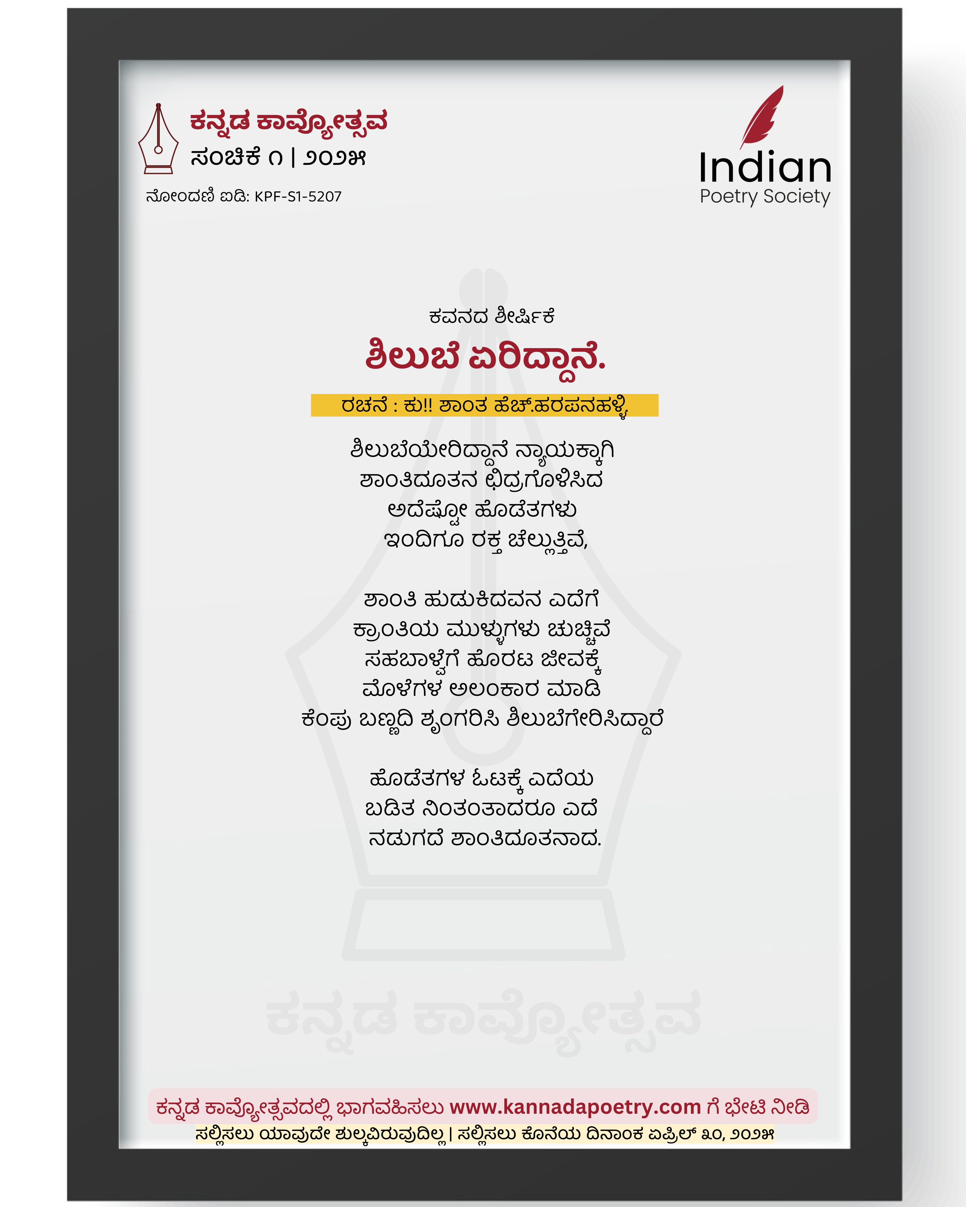 ಶಿಲುಬೆಯೇರಿದ್ದಾನೆ ನ್ಯಾಯಕ್ಕಾಗಿ ಶಾಂತಿದೂತನ ಛಿದ್ರಗೊಳಿಸಿದ ಅದೆಷ್ಟೋ ಹೊಡೆತಗಳು ಇಂದಿಗೂ ರಕ್ತ ಚೆಲ್ಲುತ್ತಿವೆ, ಶಾಂತಿ ಹುಡುಕಿದವನ ಎದೆಗೆ ಕ್ರಾಂತಿಯ ಮುಳ್ಳುಗಳು ಚುಚ್ಚಿವೆ ಸಹಬಾಳ್ವೆಗೆ ಹೊರಟ ಜೀವಕ್ಕೆ ಮೊಳೆಗಳ ಅಲಂಕಾರ ಮಾಡಿ ಕೆಂಪು ಬಣ್ಣದಿ ಶೃಂಗರಿಸಿ ಶಿಲುಬೆಗೇರಿಸಿದ್ದಾರೆ ಹೊಡೆತಗಳ ಓಟಕ್ಕೆ ಎದೆಯ ಬಡಿತ ನಿಂತಂತಾದರೂ ಎದೆ ನಡುಗದೆ ಶಾಂತಿದೂತನಾದ.