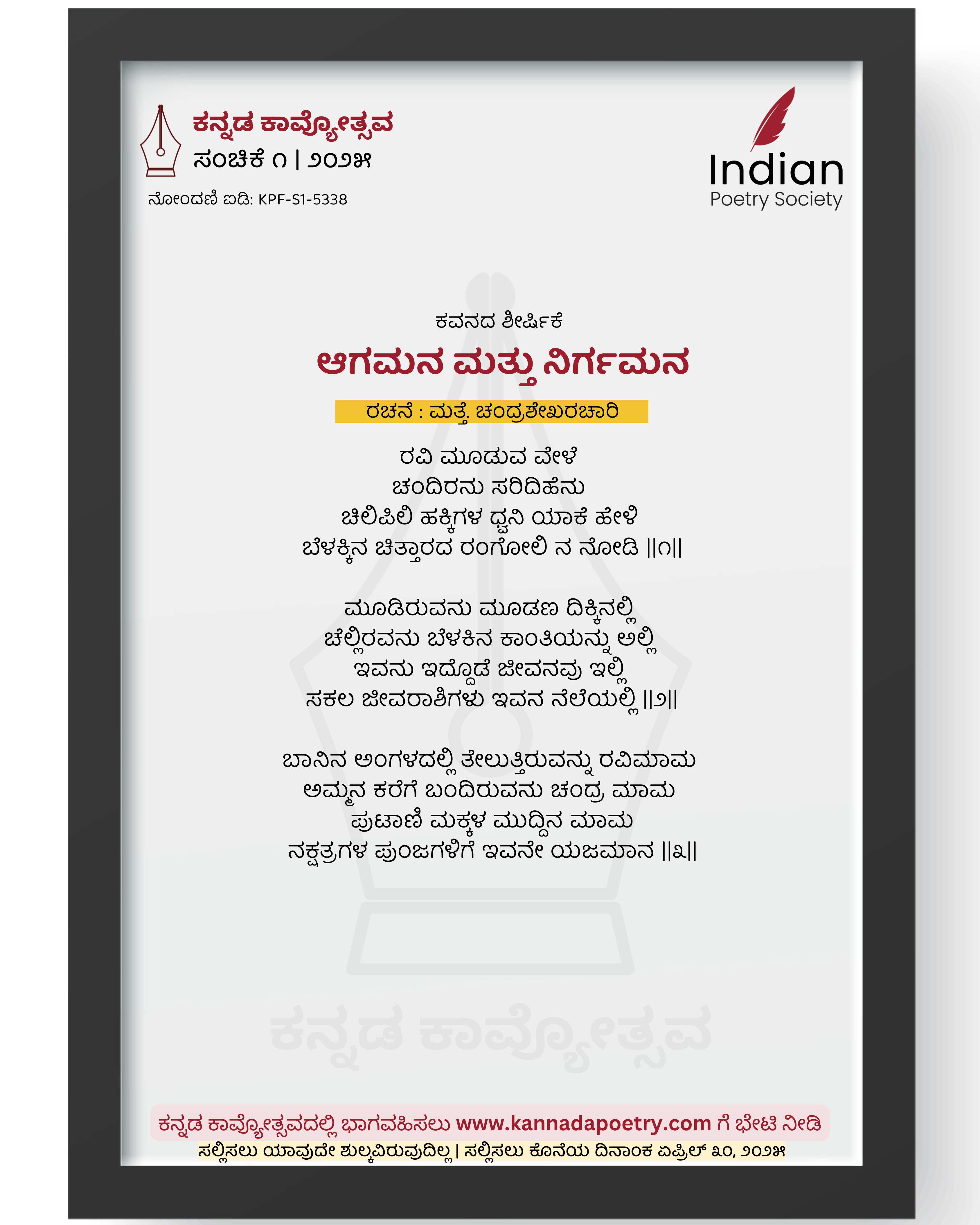 ರವಿ ಮೂಡುವ ವೇಳೆ ಚಂದಿರನು ಸರಿದಿಹೆನು ಚಿಲಿಪಿಲಿ ಹಕ್ಕಿಗಳ ಧ್ವನಿ ಯಾಕೆ ಹೇಳಿ ಬೆಳಕ್ಕಿನ ಚಿತ್ತಾರದ ರಂಗೋಲಿ ನ ನೋಡಿ ||೧|| ಮೂಡಿರುವನು ಮೂಡಣ ದಿಕ್ಕಿನಲ್ಲಿ ಚೆಲ್ಲಿರವನು ಬೆಳಕಿನ ಕಾಂತಿಯನ್ನು ಅಲ್ಲಿ ಇವನು ಇದ್ದೊಡೆ ಜೀವನವು ಇಲ್ಲಿ ಸಕಲ ಜೀವರಾಶಿಗಳು ಇವನ ನೆಲೆಯಲ್ಲಿ ||೨|| ಬಾನಿನ ಅಂಗಳದಲ್ಲಿ ತೇಲುತ್ತಿರುವನ್ನು ರವಿಮಾಮ ಅಮ್ಮನ ಕರೆಗೆ ಬಂದಿರುವನು ಚಂದ್ರ ಮಾಮ ಪುಟಾಣಿ ಮಕ್ಕಳ ಮುದ್ದಿನ ಮಾಮ ನಕ್ಷತ್ರಗಳ ಪುಂಜಗಳಿಗೆ ಇವನೇ ಯಜಮಾನ ||೩||