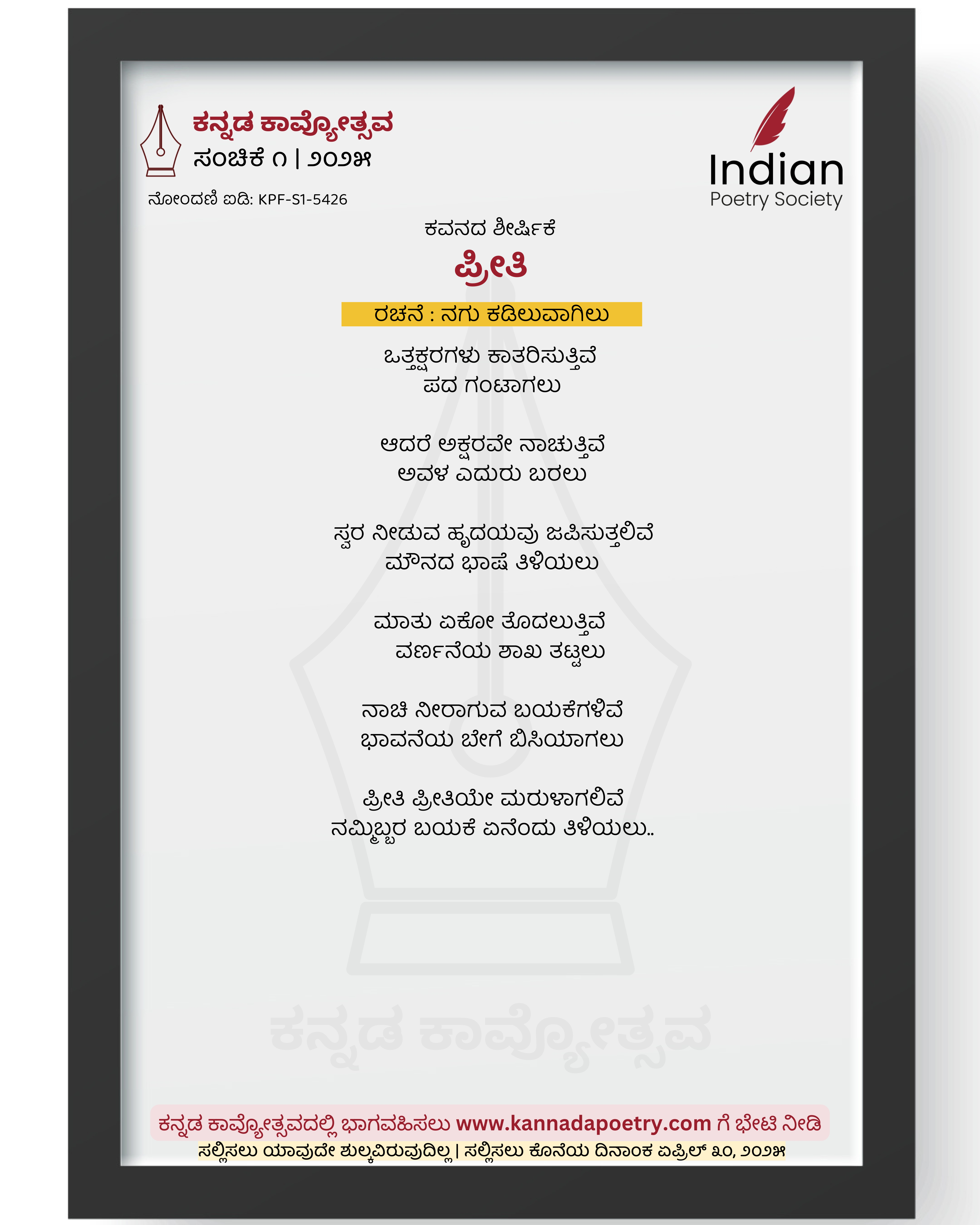 ಒತ್ತಕ್ಷರಗಳು ಕಾತರಿಸುತ್ತಿವೆ ಪದ ಗಂಟಾಗಲು ಆದರೆ ಅಕ್ಷರವೇ ನಾಚುತ್ತಿವೆ ಅವಳ ಎದುರು ಬರಲು ಸ್ವರ ನೀಡುವ ಹೃದಯವು ಜಪಿಸುತ್ತಲಿವೆ ಮೌನದ ಭಾಷೆ ತಿಳಿಯಲು ಮಾತು ಏಕೋ ತೊದಲುತ್ತಿವೆ ವರ್ಣನೆಯ ಶಾಖ ತಟ್ಟಲು ನಾಚಿ ನೀರಾಗುವ ಬಯಕೆಗಳಿವೆ ಭಾವನೆಯ ಬೇಗೆ ಬಿಸಿಯಾಗಲು ಪ್ರೀತಿ ಪ್ರೀತಿಯೇ ಮರುಳಾಗಲಿವೆ ನಮ್ಮಿಬ್ಬರ ಬಯಕೆ ಏನೆಂದು ತಿಳಿಯಲು..